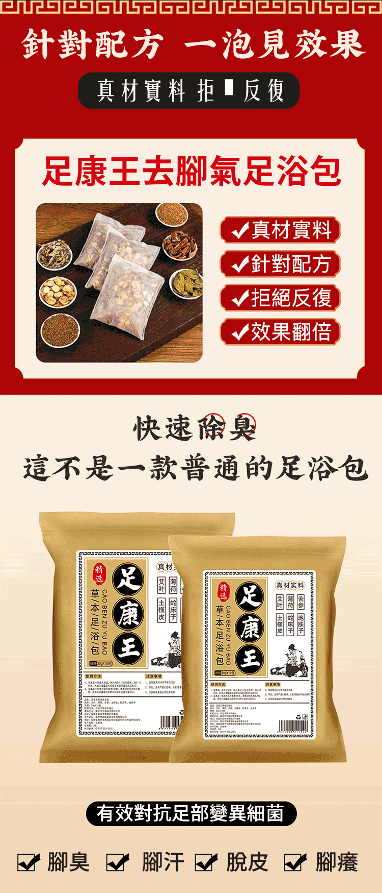 足康王草本足浴包是去腳氣腳臭藥包、除臭腳汗腳止汗酸臭味治臭腳克星泡腳包男女神器,香港腳泡腳包,徹底根除腳臭、抑菌止癢中藥養生泡腳包專賣店出售最受網友好評的泡腳藥包,足浴粉含有艾草、藏紅花、老薑、益母草等中藥成份的足浴包。